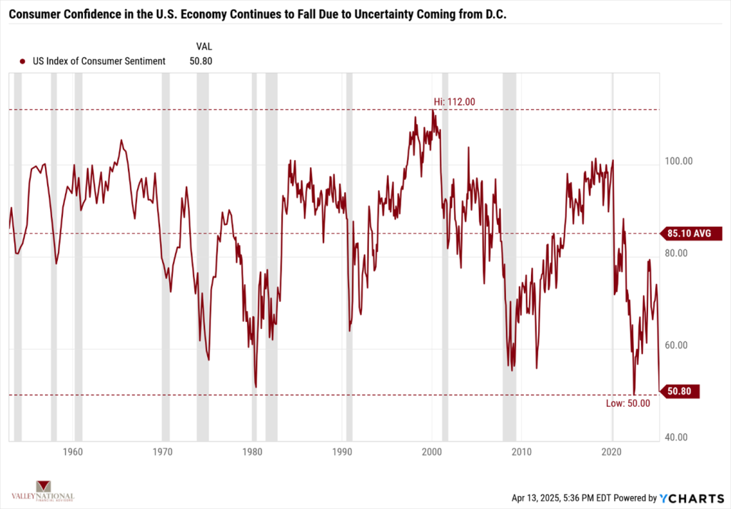 Consumer Sentiment is reaching levels not seen since the Great Financial Crisis. See Chart 1 below from Valley National Financial Advisors and Y Charts.