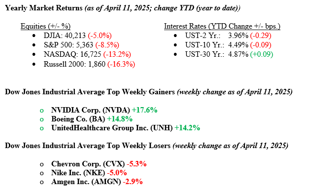 In the rare chance that our readers were not watching the news or markets last week, we are here to tell you that last week was a bit volatile. We saw the biggest one-day rally since the Great Financial Crisis. Market Volatility spiked to “Covid-like” levels, and a sell-off in bonds sent yields surging while the U.S. Dollar slid, and gold rose to a new record high of $3,245/Troy ounce. Within all that noise, by the end of the week, all three major averages ended the week with a positive return: Dow Jones (+5.0%), S&P 500 Index (+5.7%), and the NASDAQ (+7.3%).  On Friday alone, the Dow closed +619 points, a shocking move to cap off a volatile week. Readers of TWC know how much we hate uncertain and unexplained volatility; however, this volatility can best be explained just as Wall Street traders called it: Self-induced pain. The news out of D.C. is so jarring and uncertain that there will be blood in the trading pits until everything settles down, and we say: “Ignore the noise and try to remain focused on long-term goals.” As mentioned, the 10-year U.S. Treasury yield rose to 4.49%, 48 basis points higher than the prior week, as investors showed an odd distaste for U.S. Treasury bonds in a tile of heightened volatility and uncertainty.
