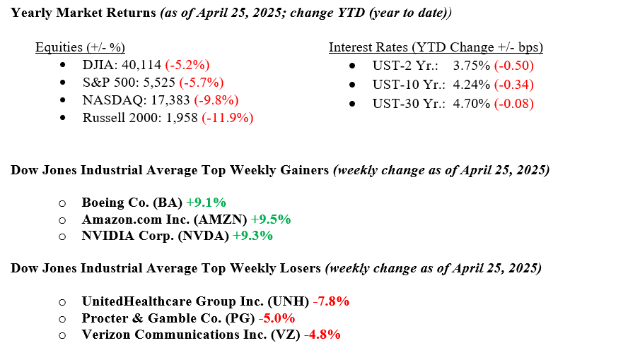 The week ahead is packed with major earnings reports from big names like Amazon, Apple, Meta, Microsoft, Mastercard, and Visa. Investors will be closely watching for updates on AI-related investments as companies like Microsoft, Amazon, and Meta continue to ramp up spending in this space. Visa and Mastercard will also provide insights into current consumer spending trends, helping us understand how resilient the consumer market is, especially in areas like travel and entertainment. On the economic front, we’ll get a batch of important data, including Q1 GDP, job openings, and consumer sentiment, all of which will give us a clearer picture of the overall economic landscape. Despite continued trade uncertainty, the economy is holding steady, supported by healthy corporate earnings and a solid jobs market. If you have any questions or need more information, contact your advisor at Valley National Financial Advisors.