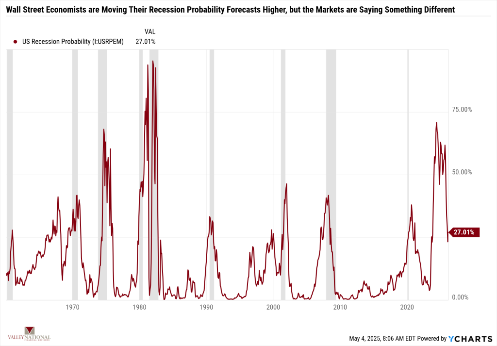 Wall Street got a dose of mixed messages last week, as a negative GDP print for Q1 2025 (-0.30%) warned of a coming recession, and an above-expectation payroll number (+177k) on Friday screamed “things are still ok” to traders and investors. Each primary stock market index increased by +3.0% for the week, marking the ninth straight positive day for U.S. equities. Strong earnings results and outlooks from Microsoft and Meta added to market optimism, with both companies highlighting continued strength in AI-related spending and deployment. Policy uncertainty remains the biggest stumbling block to a growing economy, weighing on consumer confidence. While many economists have increased their probability of recession, the markets are showing only a 27% chance (see Chart 1 below). The Federal Reserve meets this week and is widely expected to leave interest rates unchanged. The 10-year U.S. Treasury yield increased by only one basis point to 4.25%, reflecting calmer bond markets.