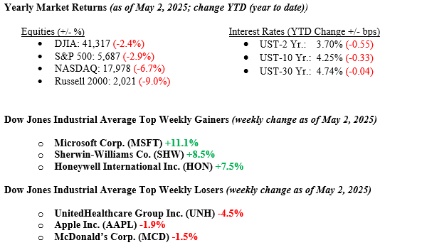 Economic data points from last week were mixed but showed the U.S. economy remains resilient despite tariff-related uncertainty and challenges. While several indicators, including consumer confidence, job openings, and ADP employment figures, came in below expectations, the labor market remained relatively solid, with April nonfarm payrolls rising by 177,000—beating expectations—and the unemployment rate holding steady at 4.2%. The first estimate of Q1 GDP showed a surprise contraction of 0.3% versus expectations for modest growth, but this was largely due to a sharp increase in imports as businesses accelerated purchases ahead of anticipated tariffs rather than a fundamental weakness in domestic demand. Inflation remained muted, with both the PCE and core PCE indices flat for March. Manufacturing data was mixed but showed some stabilization. Overall, the economy continues to demonstrate underlying resilience in the face of trade-related disruptions and geopolitical uncertainty.