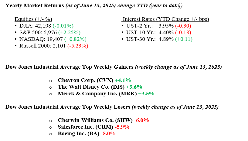 Last week, U.S. equity markets swung between gains and losses: the S&P 500, after rallying early, finished down about 0.25%, the Dow held flat, and the Nasdaq fell 0.5%. Geopolitical flare-ups after Israel’s strike on Iran sent oil prices up 8% and drove investors toward gold and the dollar. However, a surprisingly strong consumer sentiment reading on Friday briefly lifted optimism. Meanwhile, better-than-expected small business optimism, with the NFIB index rising to 98.8 in May, signaled improved sentiment among Main Street businesses. Alongside tame inflation readings, with CPI and PPI rising less than expected in May, this has bolstered hopes that the Fed may begin cutting rates later this year. Despite late-week jitters, the S&P 500 is still up around 20% from its April 8 low, showing resilience amid tariff and China-trade headwinds. After large-scale military actions by Israel and Iran, there was a massive flight to quality, and as a result, U.S. Treasury bonds rallied. The 10-year Treasury yield decreased 11 basis points to close the week at 4.40%.