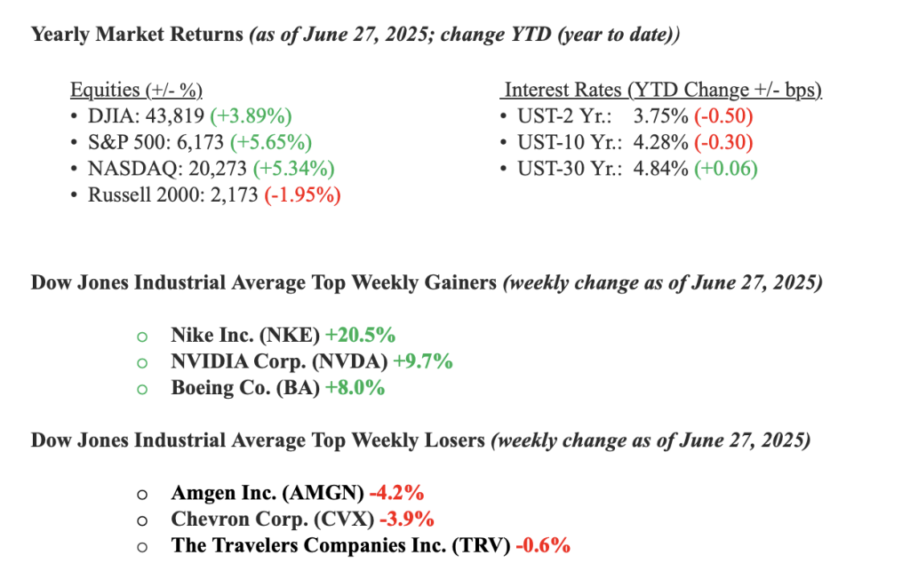 As markets approach the shortened July 4th holiday weekend, the outlook remains cautiously optimistic, buoyed by a robust 4.0% rally in the S&P 500 to a new record high, positive developments in U.S.-China tariff negotiations, and a tenuous Israel-Iran ceasefire. Despite the first quarter GDP being revised down to -0.5%, it’s encouraging to see economists expecting a return to growth in Q2 2025, as the import surge seen earlier, driven by efforts to beat tariffs, begins to normalize. The advancing ‘Big, Beautiful Bill’ tax package, along with a solid consumer sentiment reading of 60.7, point to potential for continued economic growth. Still, challenges like a cooling labor market and lingering inflation concerns will need to be watched closely. At Valley National Financial Advisors, we remain vigilant, leveraging our belief in the market’s efficiency to guide your investments, and we encourage you to reach out to your advisor for personalized insights or support.