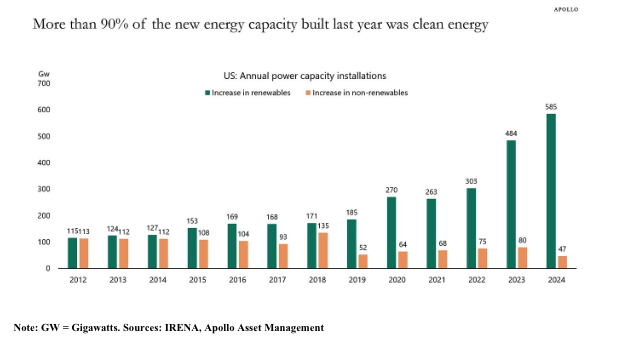 U.S. policy and politics are shaped by President Trump’s bold trade agenda, with the “One Big Beautiful Bill” raising the debt ceiling by $5 trillion and delivering sweeping tax cuts, despite fiscal conservative concerns over its $4.7 trillion decade-long cost. However, progressive wins like Zohran Mamdani’s New York City mayoral upset highlight a dynamic political landscape taking place in the U.S. The announced 30% tariffs on EU and Mexican imports, effective August 1, and a proposed 15–20% blanket tariff increase have sparked debate, but also opportunity, as they encourage domestic production, including in renewable energy. On the renewable energy front, the bill’s shift from phasing out Biden-era wind and solar credits (e.g., $7,500 for new EVs) to boosting geothermal and nuclear power presents a promising pivot, leveraging stable, homegrown energy sources that align with national security and could attract significant investment amid global supply chain challenges. This strategic realignment offers investors a chance to capitalize on growing demand for reliable, innovative clean energy solutions, positioning the U.S. as a leader in sustainable technology with long-term growth potential. See the chart below from Apollo showing how significant renewable energy is among new domestic power production installations.