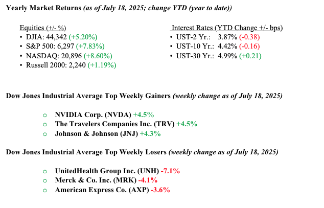 It’s shaping up to be a busy week, with a wave of earnings reports coming in from major players like Google, SAP, Tesla, Union Pacific, Blackstone, and Intel. These results will give investors an update on how big tech, transportation, and private investment managers are holding up. On the economic side, we’ll be watching for new data on home sales, durable goods orders, and key PMI readings for both the services and manufacturing sectors, which should offer more insight into the broader health of the economy. Fed Chair Jerome Powell is also scheduled to deliver opening remarks at a banking conference on Tuesday, and markets will be listening closely for any signals on interest rate policy or the Fed’s economic outlook. On top of all that, attention will be on trade developments, especially as we approach the recently set August 1st deadline, which could bring some important updates or shifts in negotiations. At Valley National Financial Advisors, we remain vigilant, recognizing the market’s efficiency while monitoring the impact of policy shifts, and we encourage you to consult your advisor for tailored guidance amidst these dynamic conditions.
