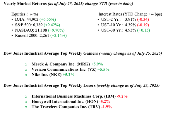 It is a packed week ahead for markets, with big-name earnings and key economic data on the way. Major companies such as Visa, Microsoft, Meta, Qualcomm, Apple, Amazon, Mastercard, Merck, and Boeing all report earnings this week, and their results could set the tone for the rest of the earnings season. On the economic side, investors will be watching for fresh updates on the job market and hoping to see Q2 GDP rebound after a weak first quarter. The Fed’s go-to inflation gauge, the PCE Index, is also due and could shape expectations for monetary policy going forward. While no rate cut is expected at Wednesday’s Fed meeting, traders will listen closely for hints on when cuts might begin. A key point to take away from this week’s EPS and economic reports is simply that: 1) companies are making a lot of money and 2) the economy continues to grow, prosper, and create more jobs for Americans. At Valley National Financial Advisors, we continue to keep a close eye on market trends and policy changes. We encourage you to contact your advisor for personalized guidance as conditions continue to evolve.