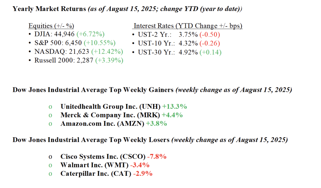 Equity markets posted solid gains last week, with the Dow rising 1.7%, the S&P 500 up 0.9%, the Nasdaq gaining 0.8%, and the Russell 2000 leading the pack with a 3.1% advance. The strength came as the Q2 2025 earnings season nears its end, revealing healthy corporate performance. Aggregate S&P 500 earnings per share grew 11% year over year, far surpassing the 4% consensus estimate. Inflation data offered a mixed picture: while the Consumer Price Index (CPI) came in line with expectations, the Producer Price Index (PPI) surprised to the upside. Still, market expectations for a Federal Reserve rate cut in September remain firmly in place, with odds holding above 90%. Investor attention also turned to commentary from Treasury Secretary Scott Bessent, who called for a bold 50-basis-point rate cut and suggested the Fed may need to ease further. Despite the hotter-than-expected PPI, U.S. Treasury yields held relatively steady, with the 10-year yield edging up just 3 basis points to end the week at 4.32%, signaling a market still largely in wait-and-see mode.