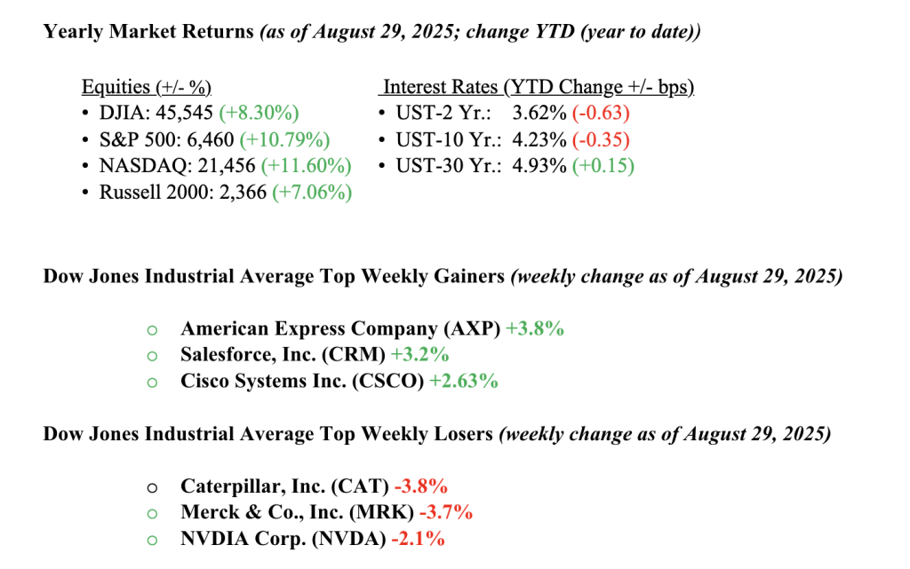 Markets ended the week slightly lower, with a Friday pullback, especially in tech stocks, wiping out gains from earlier in the week. The Nasdaq lagged the S&P 500 and Dow, but overall, August was a solid month for investors. The S&P 500 rose about 1.9%, with total returns at 10.8% year to date. The Nasdaq is up over 11% year to date. Economic data showed inflation ticking up slightly in July, while second-quarter GDP growth was revised higher, suggesting the economy remains relatively stable. One of the week’s key highlights was NVIDIA’s highly anticipated earnings report, which topped expectations. CEO Jensen Huang noted that demand for AI data center infrastructure remains strong, helping to boost investor sentiment midweek. Corporate earnings overall have remained solid, with most companies reporting healthy profit growth. While markets have shown resilience, uncertainty around inflation, interest rates, and global conditions could lead to more volatility ahead. Treasury yields fell, with the 10-year U.S. Treasury dropping four basis points to end the week at 4.23%.