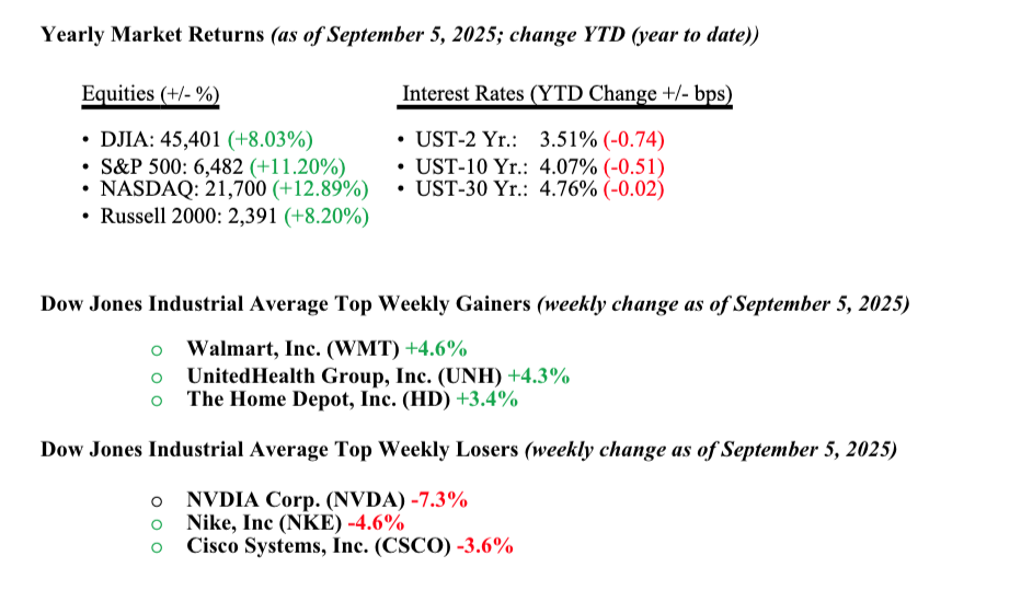 Markets had mixed performance last week, with the Dow Jones Industrial Average dipping 0.3%, the S&P 500 rising 0.3%, and the Nasdaq climbing 1.1%. All three major indexes remain within one percentage point of their recent record highs, reflecting a relatively resilient market backdrop. A significant boost midweek occurred after a federal court ruled in favor of Alphabet (GOOG) in an antitrust case, sparking a rally in the Nasdaq and the broader tech sector. Early-week volatility, along with a sharp rise in U.S. Treasury yields, was fueled by uncertainty over whether the Supreme Court may rule the White House’s tariffs unconstitutional in the coming months. However, yields eased later in the week following a string of softer-than-expected labor market data, including weak job openings, higher jobless claims, and disappointing August nonfarm payrolls, which signaled a cooling but not collapsing jobs market. Separately, oil prices dropped sharply on Wednesday after reports emerged that OPEC+ may be considering another production hike, raising concerns about oversupply. Treasury yields fell, with the 10-year U.S. Treasury dropping 16 basis points to end the week at 4.08%.