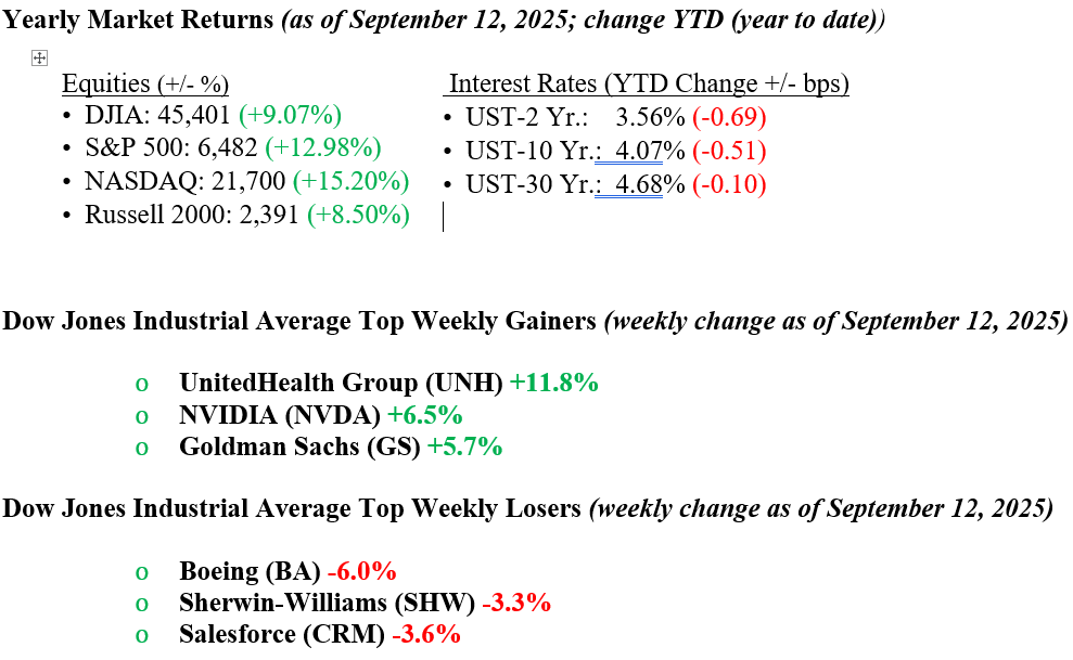 U.S. stock markets posted strong gains this week, with all major indexes reaching new record highs. The Dow Jones Industrial Average rose 1%, the S&P 500 climbed 1.6%, and the Nasdaq Composite led the way with a 2% gain, while the small-cap Russell 2000 saw a more modest increase of 0.3%. Much of the optimism was driven by continued enthusiasm around the artificial intelligence boom, which was further bolstered by Oracle’s mid-week earnings report, revealing a significantly larger business backlog than expected. While some economic data pointed to potential challenges, such as a higher-than-anticipated CPI reading, softening in the labor market, and declining consumer confidence, investors seem confident that these issues are temporary. Markets are increasingly pricing in the likelihood of numerous Federal Reserve rate cuts. In addition, reassuring comments from Visa and Mastercard management suggested that consumer spending remains healthy and resilient, helping to reinforce the market’s positive outlook, despite ongoing macroeconomic uncertainty. Treasury yields fell, with the 10-year U.S. Treasury dropping four basis points to end the week at 4.07%.