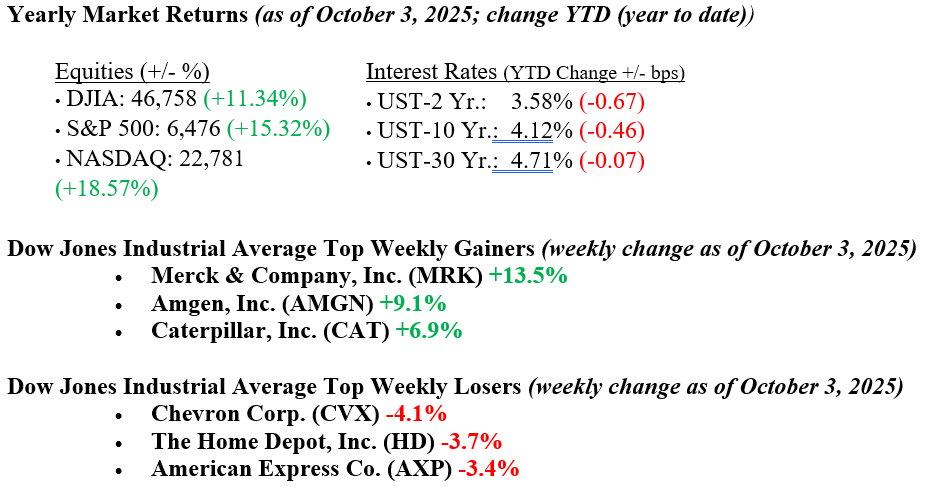 Markets rallied across the board as each major index climbed more than 1% for the week. The government shutdown turned out to be just another bad movie from Washington, D.C. as leaders from both parties failed to reach an agreement to extend funding, even temporarily. It is poignantly ironic that the markets shrugged off the malaise in Washington and instead focused on the growth of EPS, the impact of trillions of dollars of AI investments by U.S. companies, and billions of dollars of investments into the U.S. manufacturing sector by foreign countries and companies, all of which will have a positive impact on the U.S. economy and growth. Treasury also rallied as yields fell across the board, and the 10-year U.S. Treasury yield ended the week at 4.12%.