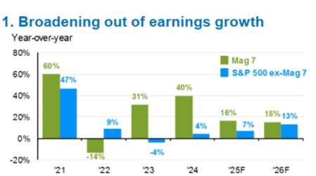 - U.S. economic activity remains healthy, and early returns on the large investments in Artificial Intelligence are beginning to emerge. There are initial signs that AI is helping improve efficiency and reduce costs across a broader range of businesses, not just within the Magnificent Seven. See Chart 1 below from J.P. Morgan showing a broadening of earnings growth from the MAG-7 companies to S&P 500 ex-MAG-7 companies. We expect this trend to continue well into 2026.