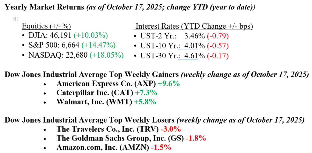 Markets had a volatile week but ultimately closed higher across the board, with the Dow up 1.6%, the S&P 500 gaining 1.7%, the NASDAQ rising 2.1%, and the Russell 2000 leading with a 2.4% increase. Notably, the recent surge in small caps has been mainly driven by speculative, unprofitable companies. Strong earnings from major U.S. banks, American Express, and Taiwan Semiconductor helped lift financials and broader indices. Meanwhile, oil prices fell to $57 per barrel amid oversupply concerns and easing geopolitical tensions following the Israel-Hamas peace deal. Some regional banks came under pressure late in the week after disclosing exposure to recent high-profile bankruptcies, though analysts currently view these issues as contained. A dovish tone from Fed Chair Powell also boosted market sentiment, with investors now pricing in a 95% to 100% chance of rate cuts at the Fed’s October and December meetings. U.S. Treasury yields declined, with the 10-year falling two basis points on the week to 4.01%.