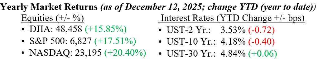 Equity markets ended the week with mixed results but moved in only small increments, nonetheless. Furthermore, year-to-date returns on all major indexes remain well into double-digit territory, as shown in the returns listed below. The 25-basis-point rate cut was what investors expected, and Fed Chairman Jay Powell reiterated his long-standing mantra that future rate movements are dictated by the data rather than opinion. We support this notion and expect only one or two more cuts in this cycle. Domestically, we maintain a preference for large-cap equities as the primary vehicle for capturing the continuing AI-driven investment cycle, which continues to provide a substantial structural boost to earnings growth. However, the recent shift away from mega-cap technology leaders toward broader sectors highlights the value of diversification and suggests a possible expansion of market leadership. The 10-year Treasury yield rose four basis points last week, closing at 4.18%.