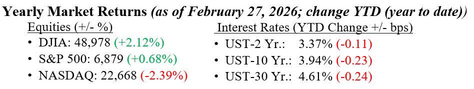 With the news over the past weekend, it seems like last week was an eternity ago. Throughout the week, equities moved higher and lower on good news and bad, with no real direction. Earlier in the week, there were fears that Artificial Intelligence (AI) would take millions of jobs and push unemployment into double digits. Later in the week, news of an imminent attack in Iran sent traders fleeing markets and scrambling to a flight to quality in U.S. Treasuries. In our view, it’s pretty simple: markets hate uncertainty. Whether it’s questions around AI, global markets, consumer demand, or broader risks to economic growth, uncertainty is what tends to drive volatility. These are the times for investors to understand why long-term investment plans include diversified portfolios with exposure to varied asset classes. With buyers increasing their U.S. Treasury exposure last week, the 10-year Treasury yield fell 14 basis points, closing at 3.94%.